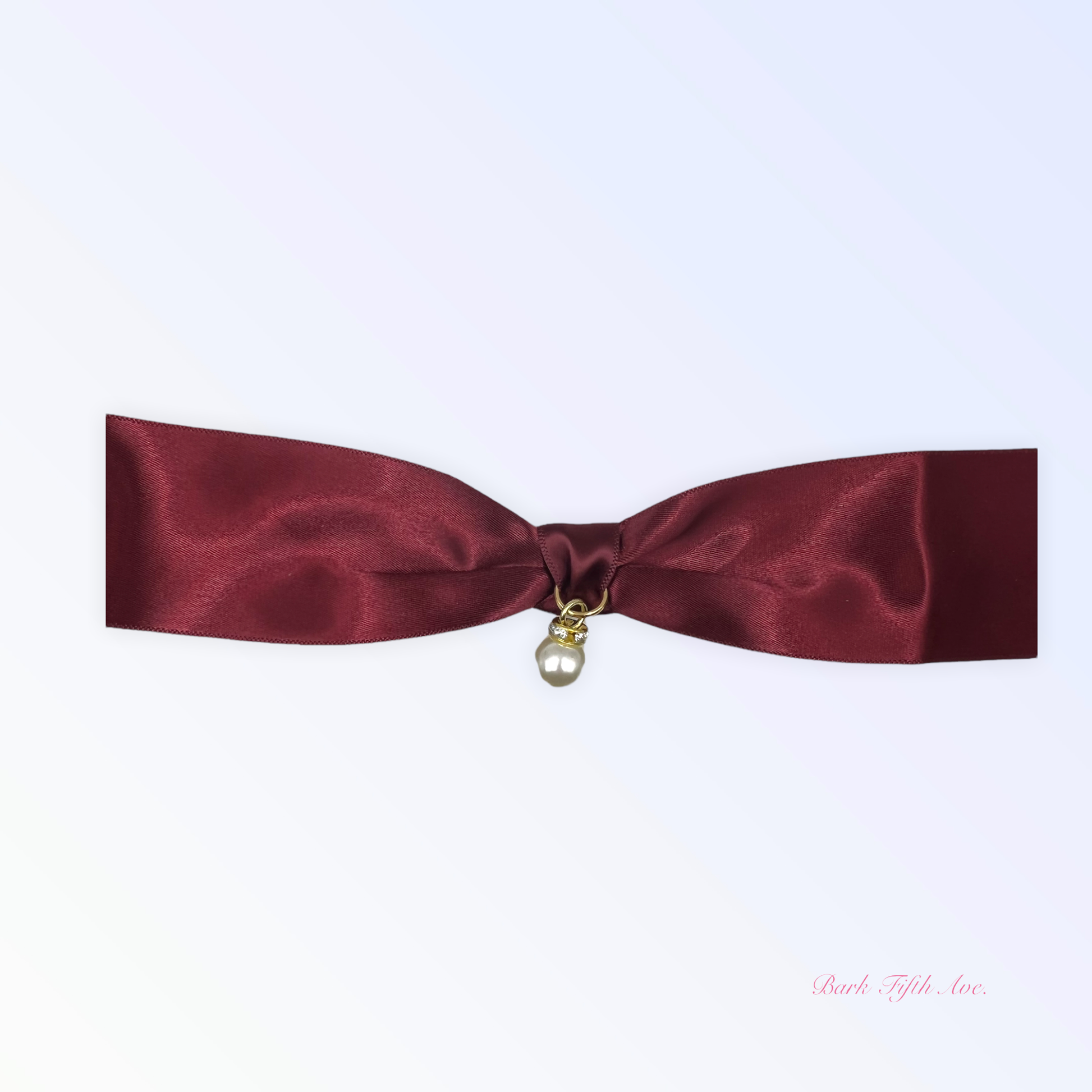 An all-around chic necklace. This satin bow necklace is adjustable from 10" up to 18". It features a stunning dangle pearl with rhinestone trim at the top.