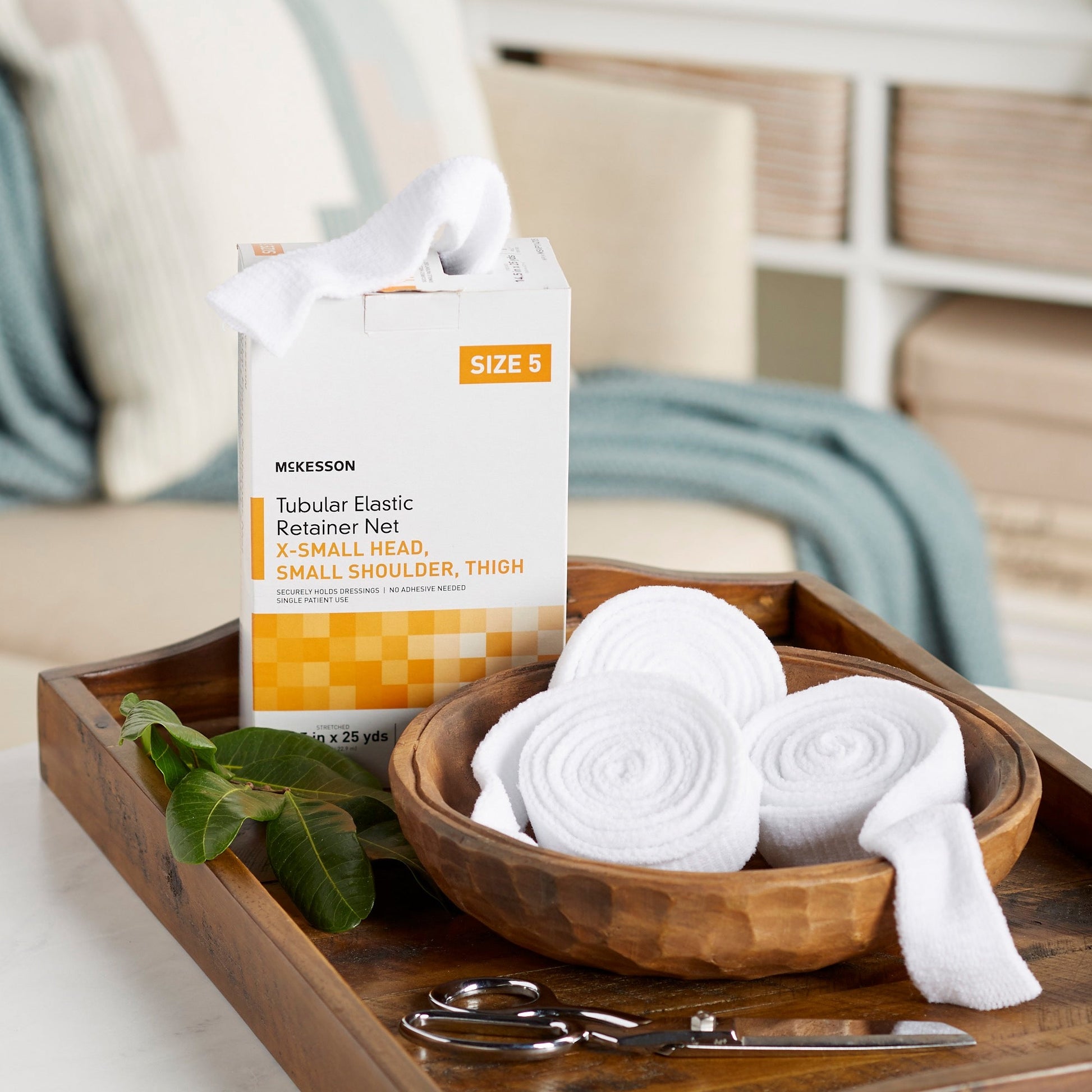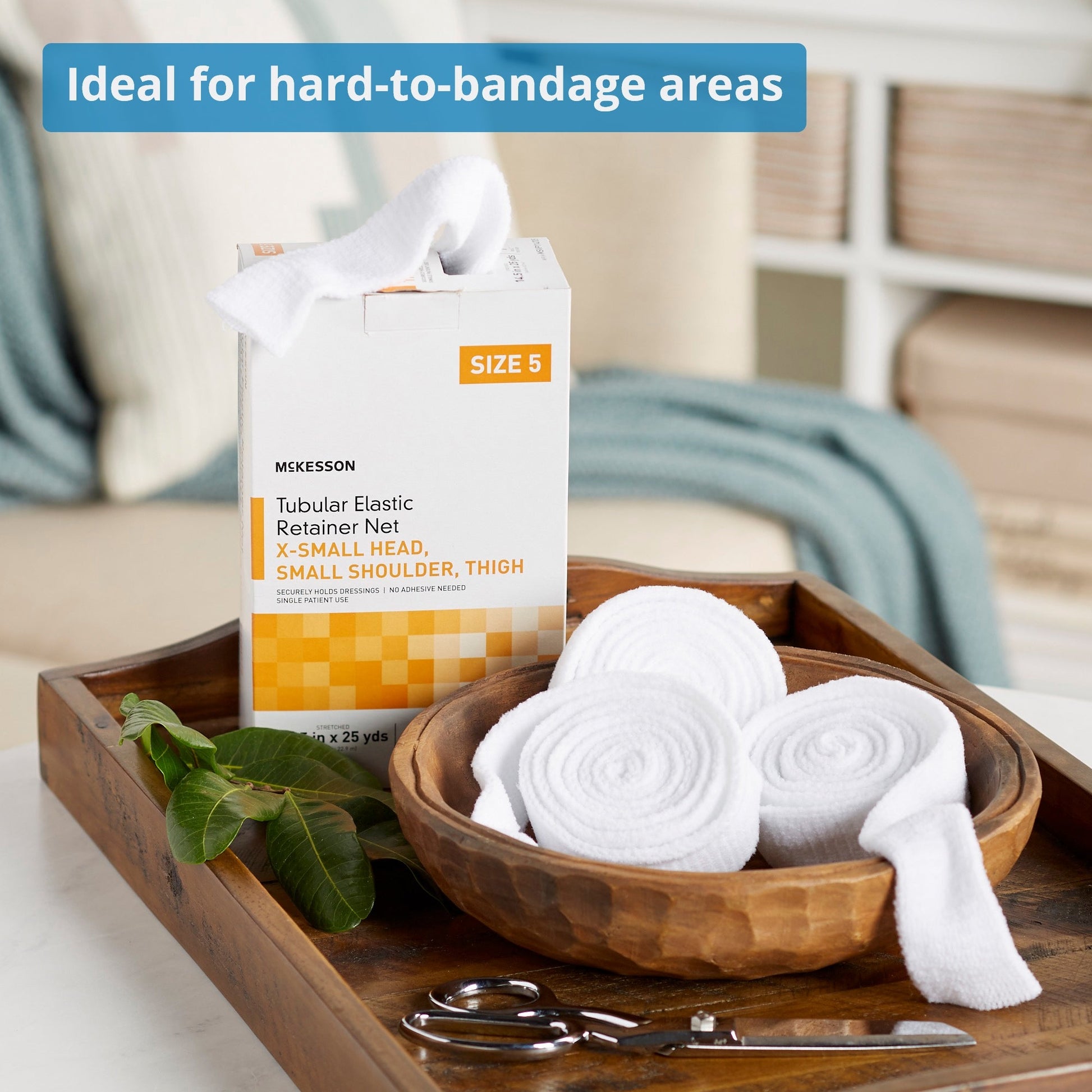Elastic Net Retainer Dressing McKesson Tubular Elastic 14-1/2 Inch X 25 Yard Size 5 White X-Small Head / Small Shoulder / Thigh NonSterile, Packaging Type- Box