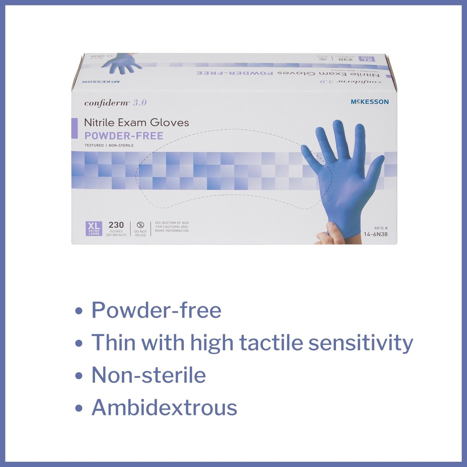 Exam Glove McKesson Confiderm 3.0 X-Large NonSterile Nitrile Standard Cuff Length Textured Fingertips Blue Not Rated, Packaging Type- Box