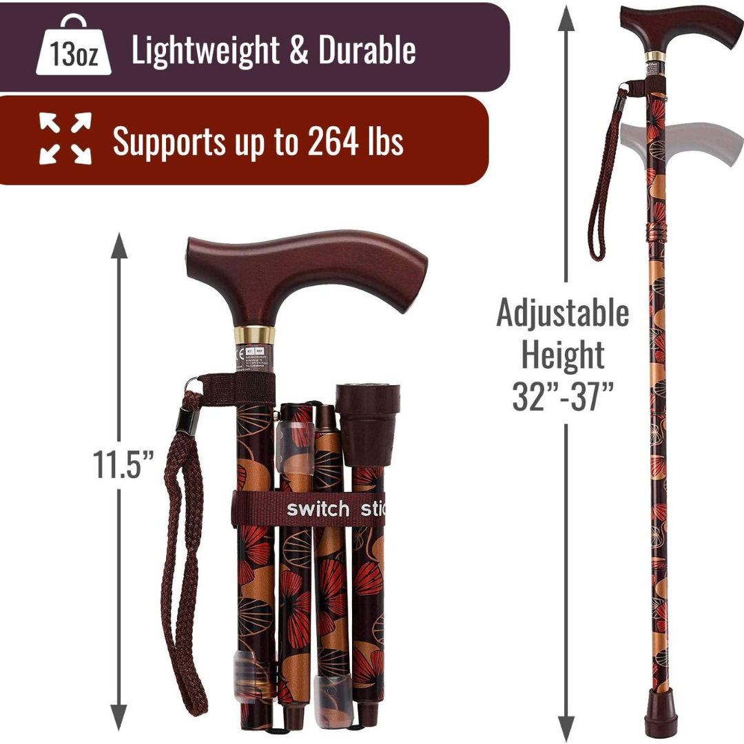 The Folding Cane Switch Sticks® Aluminum 32 to 37 Inch Height Mimi Print offers reliable walking support with a stylish and adjustable design, making it ideal for daily use and travel. Its lightweight construction ensures ease of transport while providing sturdy stability for those in need of extra balance assistance.