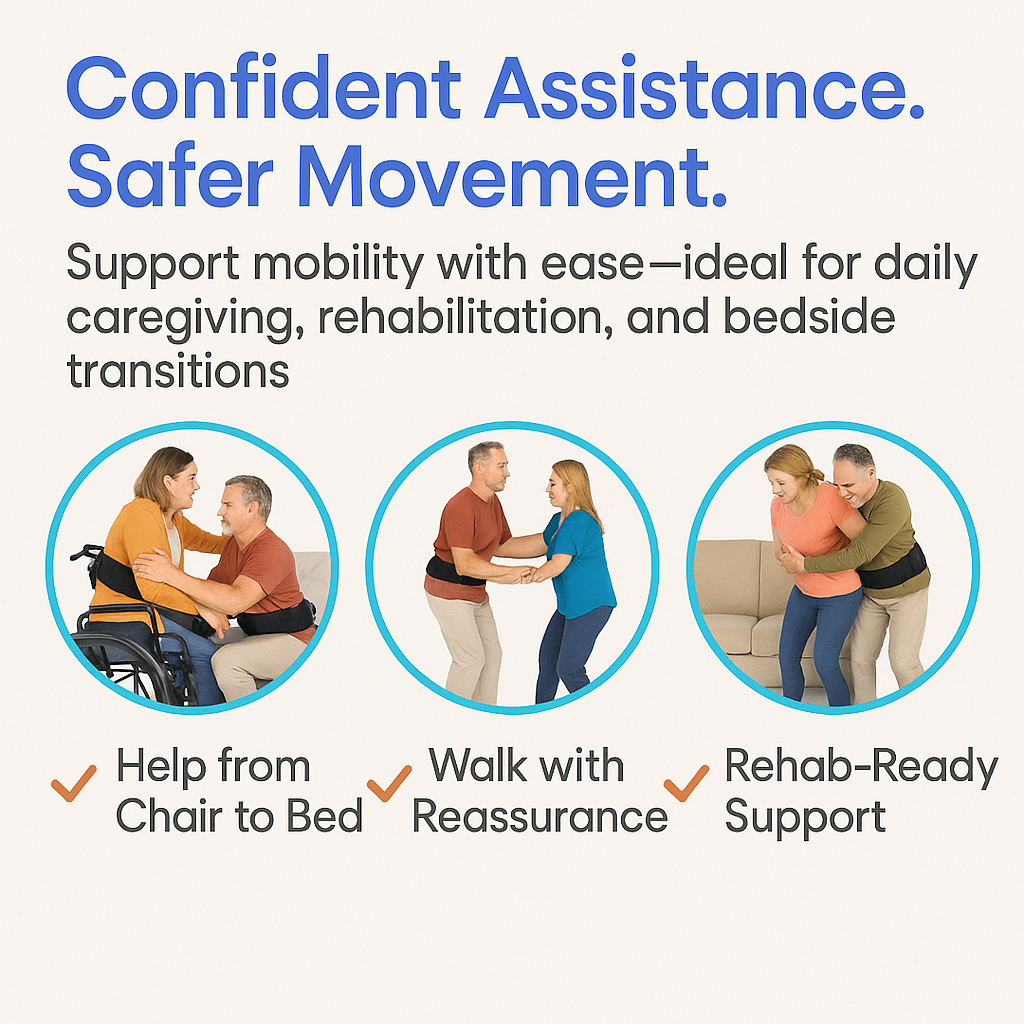 • Safe, Controlled Assistance – Reduces the risk of falls or strain during transfers, standing, or walking support.